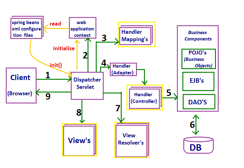 - Once if all these objects are initialized successfully, the DispatcherServlet instance is put into service, which provides an entry point to serve the client requests using the special frame work objects.