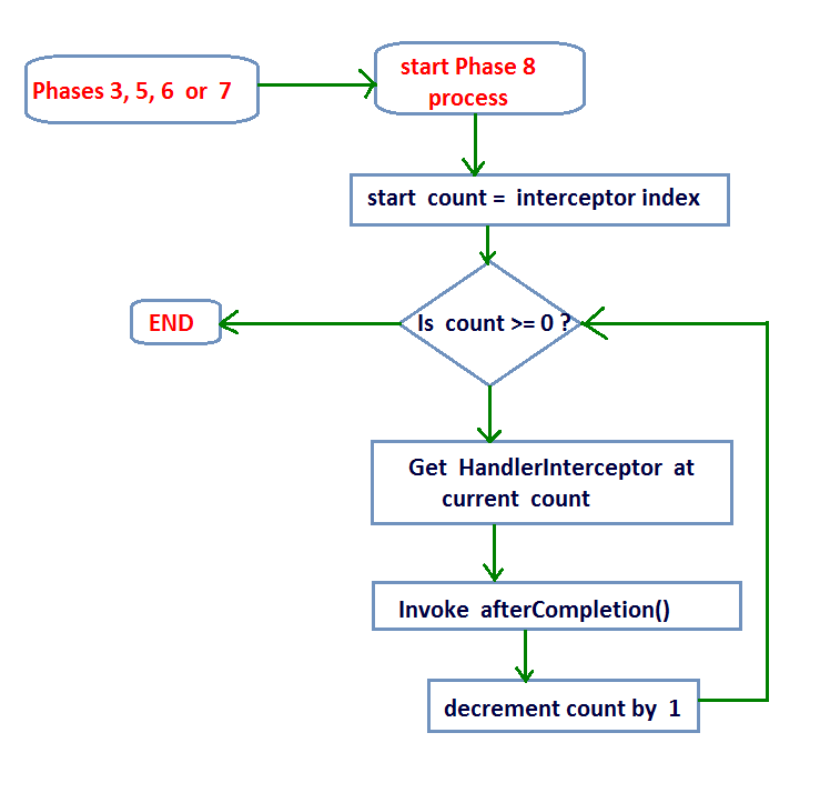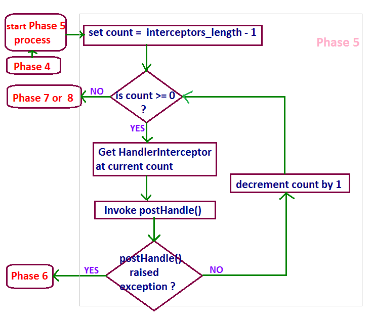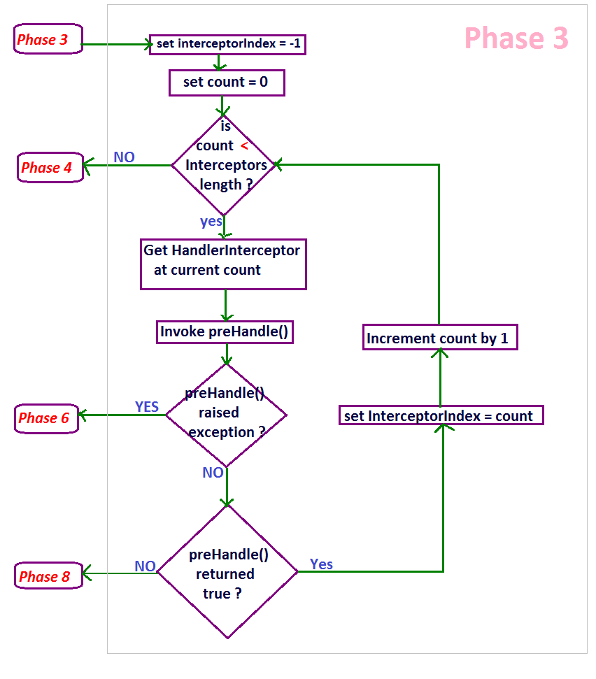 - That is, if the workflow reaches to this phase from Phase 5 then the interceptorIndex will be equal to the interceptors length minus 1(interceptorsLength - 1) since the preHandle() of all the interceptors are executed successfully.