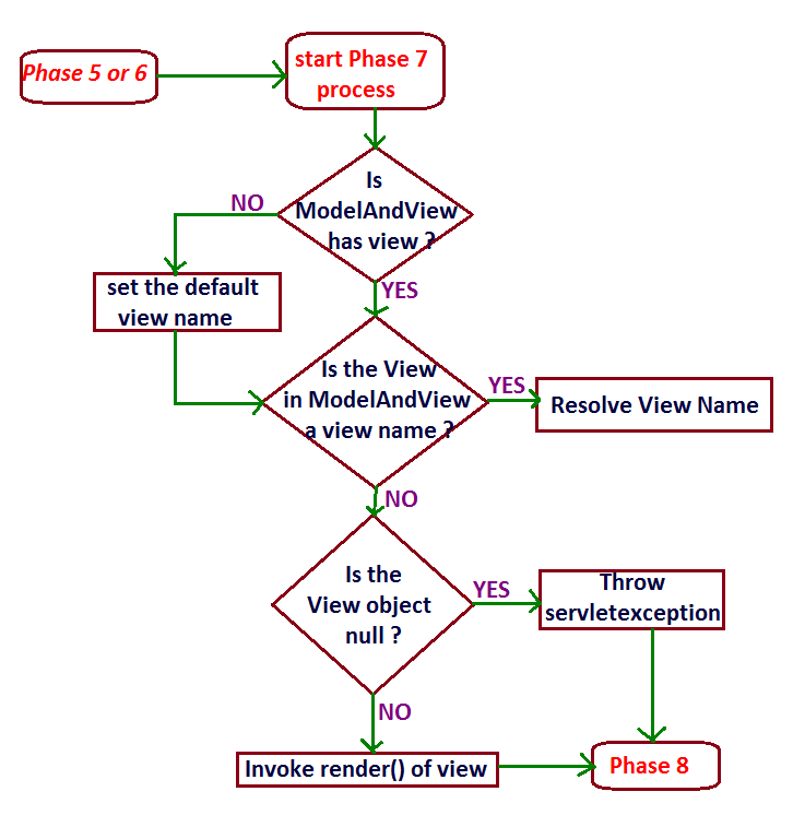- The work flow of Phase 7 of Spring Web Mvc request processing work flow starts with finding for the view in the ModelAndView object produced in the previous phases (Phase 4 or 6).
