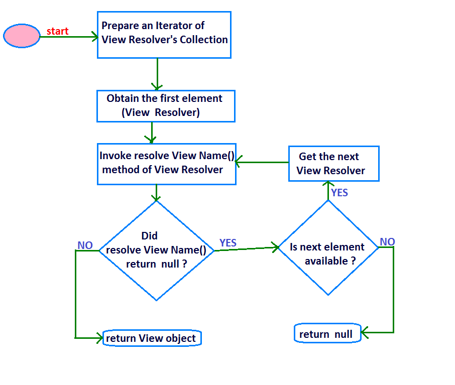 - The wokflow starts with the preparation of an iterator of the collection storing the ViewResolver objects. This collection is created while the DispatcherServlet is being initialized. Thereafter the first element is retrieved from the iterator.